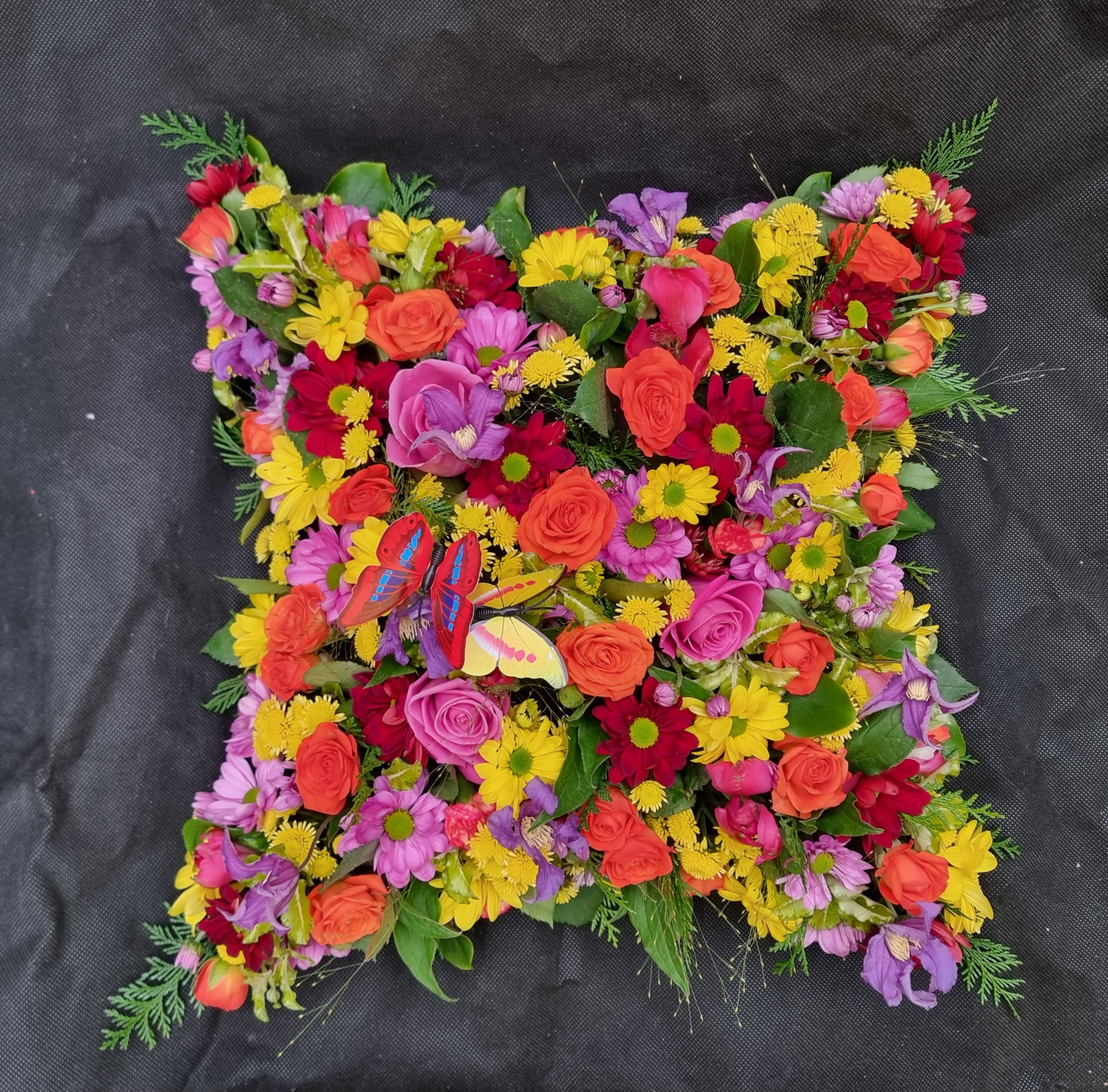 These lovely cushions or pillows feature beautiful floral arrangements symbolise a sense of soft, peaceful rest and comfort. Created with a base of chrysanthemums, they come with either a foliage or ribbon edge, topped off with a matching floral spray for that extra touch of elegance. If you're looking to make them a little more personal, feel free to add a ribbon or any small trinket that speaks to you! They come in sizes ranging from 15" to 21".
